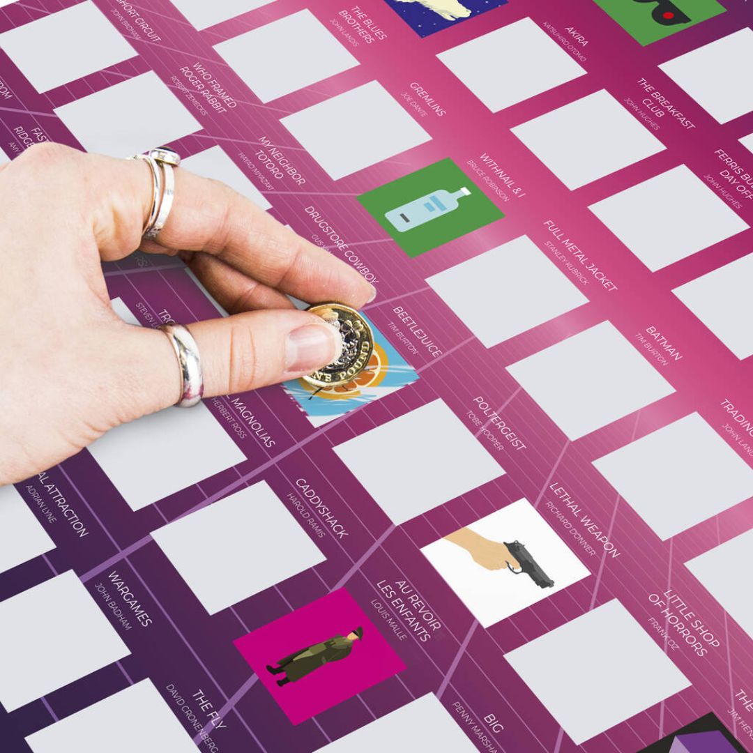 Love the ’80s? From action heroes and wacky sci-fi to timeless rom-coms with killer soundtracks, this poster is your ultimate watchlist. Scratch each square as you tick off iconic films to reveal a retro illustration underneath — perfect for movie nights with friends and family.