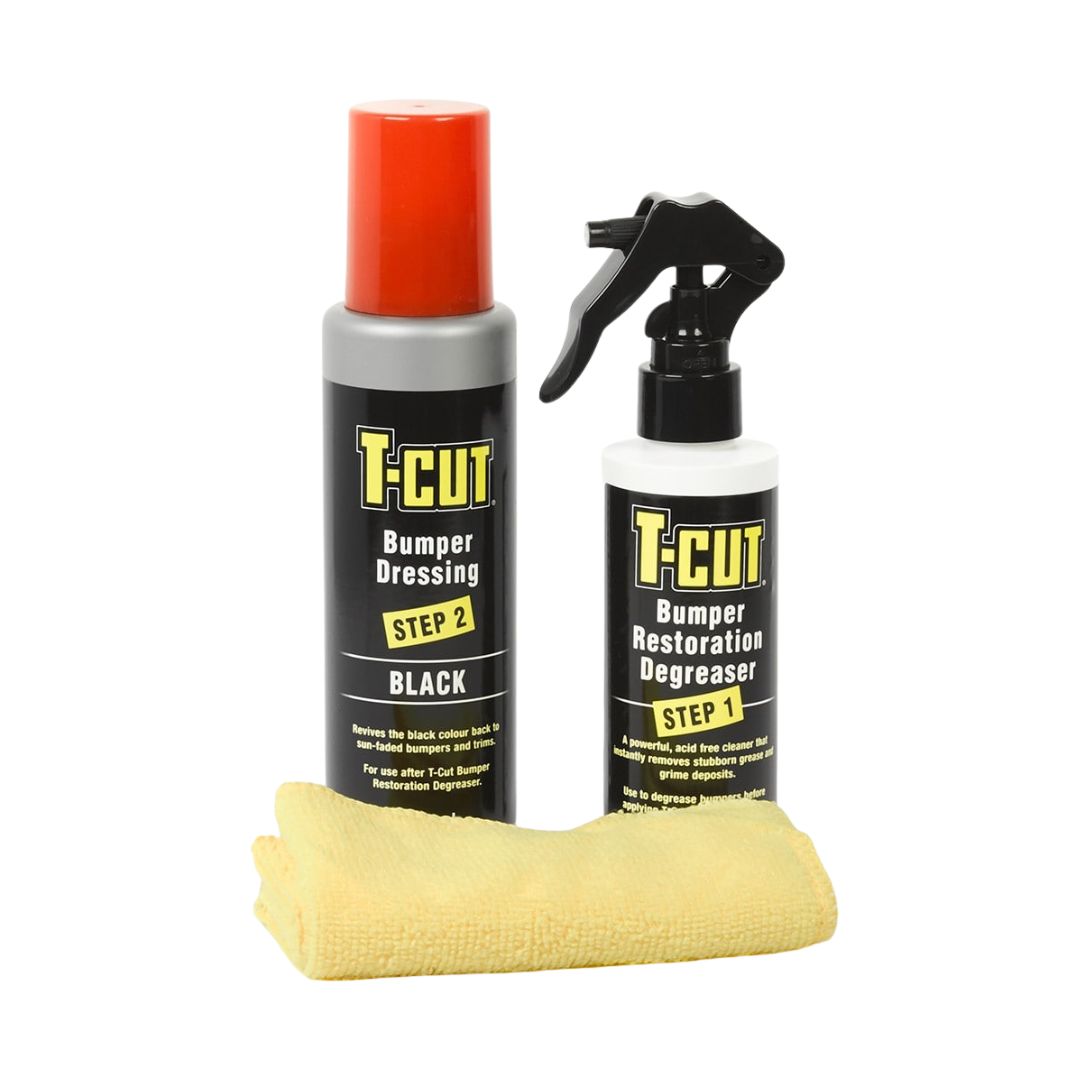 T-Cut Degreaser 125 ml, T-Cut Bumper & Trim Treatment 200 ml (Black), and 1 Ă microfibre cloth.